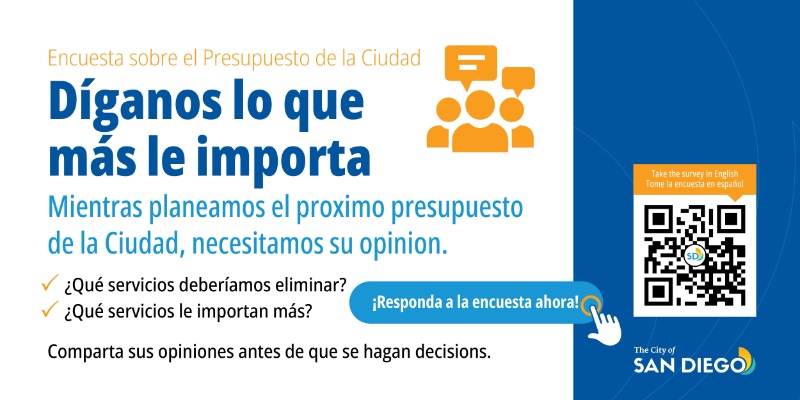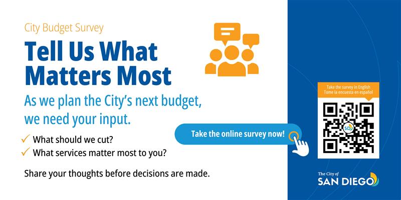 The Resident Budget Survey, in English and Spanish, will be available until the beginning of May 2026. In addition to this survey, there are many ways San Diegans can get involved in the budget development process (https://www.sandiego.gov/cityclerk/participate). Residents are encouraged to attend City Council budget meetings and to provide public comment, either by attending in person at the City Administration Building in Downtown San Diego or via Zoom. The next City Council session to discuss the budget will be Tuesday, March 10, at 6 p.m.