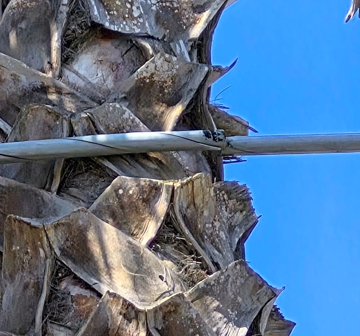 4647 Rhode Island St, San Diego, CA 92116, USA, San Diego, CAThere’s a power line that runs through a large cluster of palm trees outside my house. A couple of years ago SDG&E put a protector around the lines so that when they rub on the trees, it won’t damage the lines. However, the protector is now damaged and the lines are in danger of being damaged by the trees. Please see photo for what I mean. The tree belongs to the city.